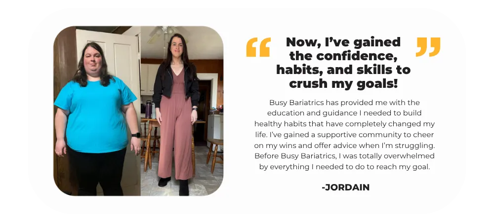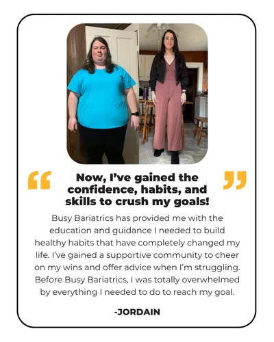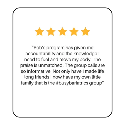 Get exclusive resources when you join Busy Bariatrics! Designed to help you feel stronger, leaner, and more energized after bariatric surgery. Don’t miss your chance to take control and feel like yourself again—only better.
