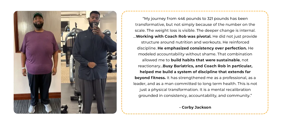 “My journey from 446 pounds to 321 pounds has been transformative, but not simply because of the number on the scale. The weight loss is visible. The deeper change is internal. ...Working with Coach Rob was pivotal. He did not just provide structure around nutrition and workouts. He reinforced discipline. He emphasized consistency over perfection. He modeled accountability without shame. That combination allowed me to build habits that were sustainable, not reactionary. Busy Bariatrics, and Coach Rob in particular, helped me build a system of discipline that extends far beyond fitness. It has strengthened me as a professional, as a leader, and as a man committed to long term health. This is not just a physical transformation. It is a mental recalibration grounded in consistency, accountability, and community.”