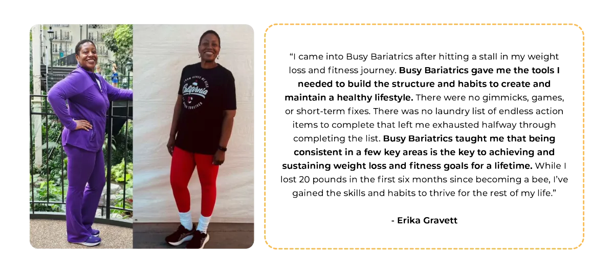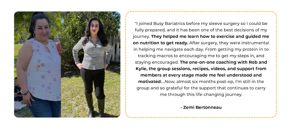 "I joined Busy Bariatrics before my sleeve surgery so I could be fully prepared, and it has been one of the best decisions of my journey. They helped me learn how to exercise and guided me on nutrition to get ready. After surgery, they were instrumental in helping me navigate each day. From getting my protein in to tracking macros to encouraging me to get my steps in, and staying encouraged. The one-on-one coaching with Rob and Kylie, the group sessions, recipes, videos, and support from members at every stage made me feel understood and motivated....Now, almost six months post-op, I’m still in the group and so grateful for the support that continues to carry me through this life-changing journey.